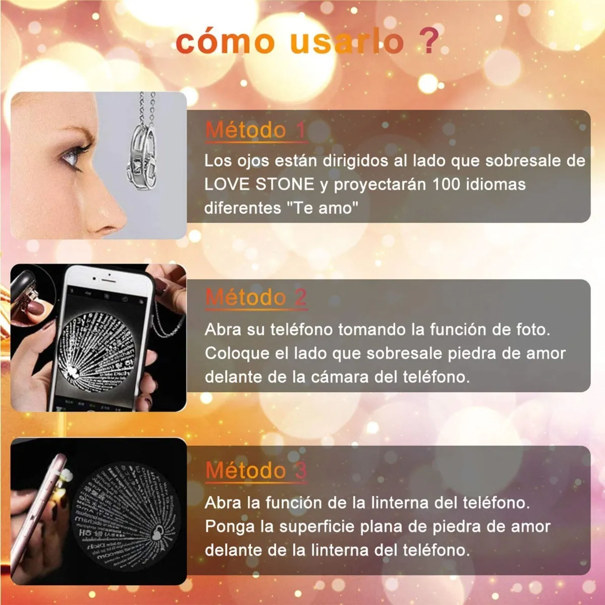 Nanotecnología de Proyección: Al mirar a través de su piedra central con la cámara del celular o proyectar luz, se revelan la frase "Te Amo" en 100 idiomas diferentes.