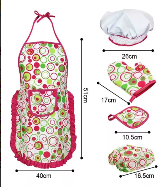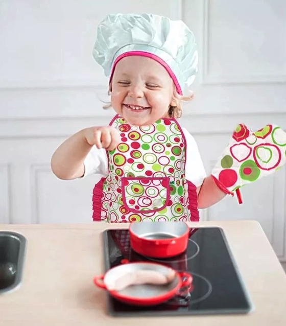 Las niñas pueden vestirse como un cocinero profesional en la cocina con sombrero de chef, delantal, manopla de horno y mangas.