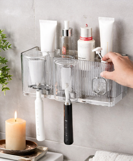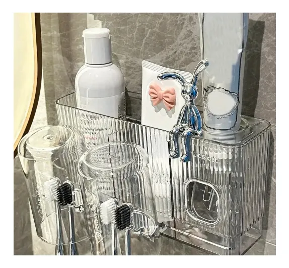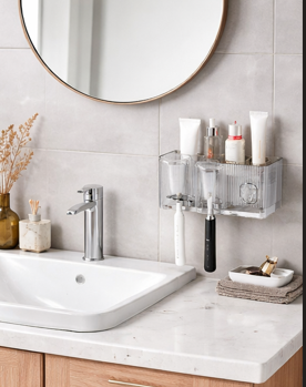 Organizador de baño práctico y moderno, ideal para mantener ordenados tus productos de higiene personal. Cuenta con compartimentos para cremas, perfumes, cosméticos y accesorios, además de espacio para cepillos de dientes y pasta dental. Su diseño transparente combina con cualquier estilo de baño y permite ver fácilmente los productos.